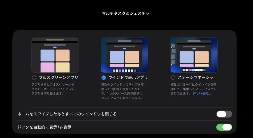 ダブルタップで最大化や戻し、2分割から4分割まで柔軟に操作できます。特に13インチモデルでのウィンドウ表示は使い方によって作業効率を最大化できる強力な選択肢です。