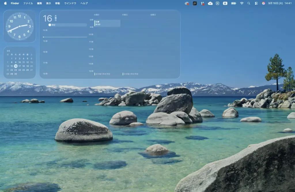 デスクトップ全体に導入され、Dockやウィンドウも立体的に。特にウィジェットのクリア化はデスクトップとの一体感があり、作業中の視覚的な心地よさが増しました。